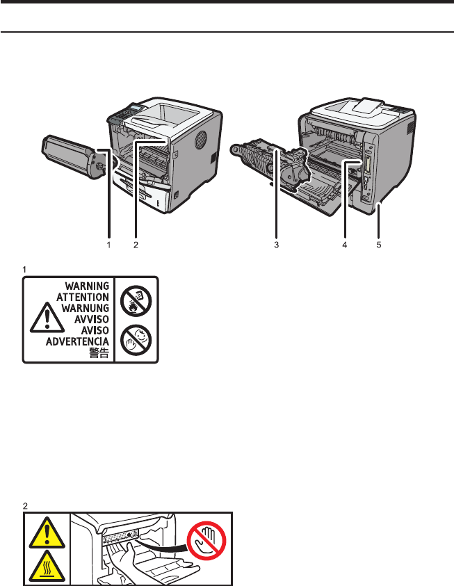 The inside of this printer becomes very hot. Do not touch parts with this label