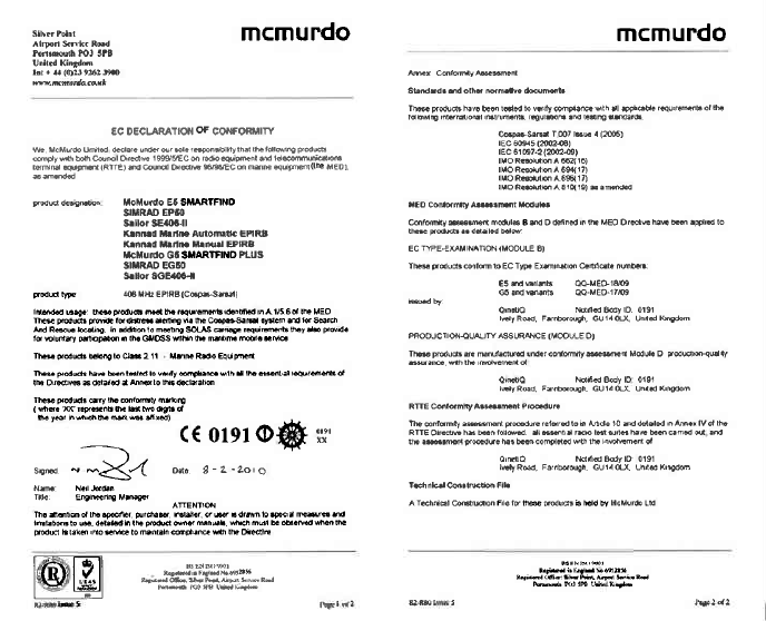 Orolia Ltd McMurdo Smartfind Plus G5, Sailor SGE406-II, Simrad EG50 McMurdo