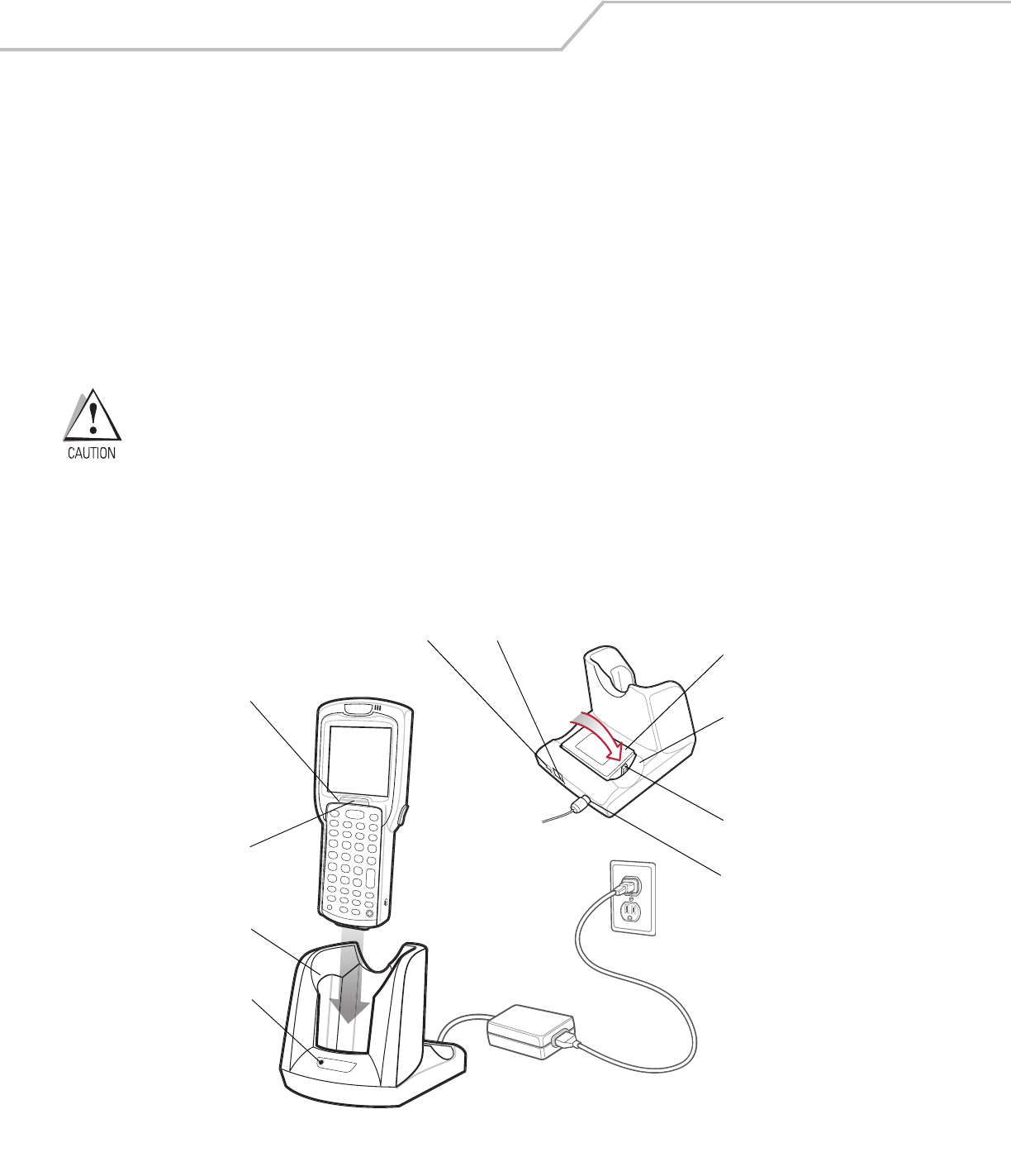 • The Single Slot Serial/USB cradle charges the mobile computer main battery and/or a spare battery. It also synchronizes the