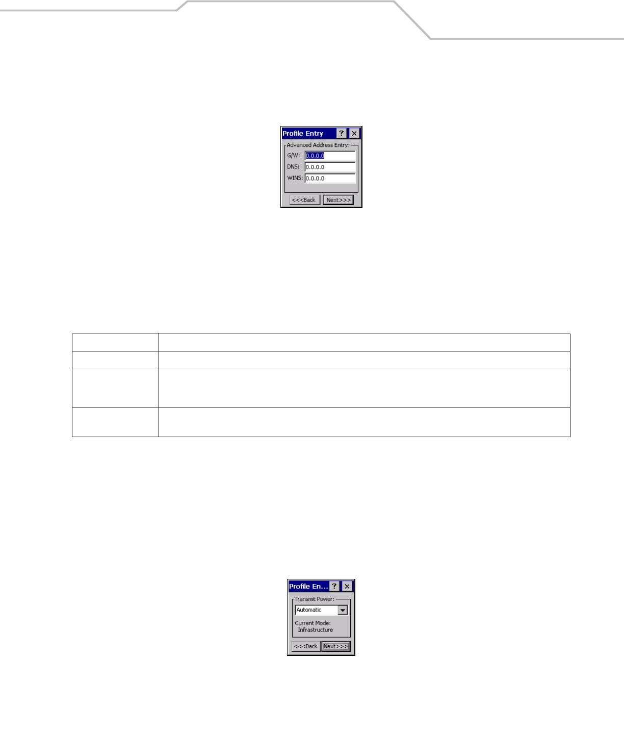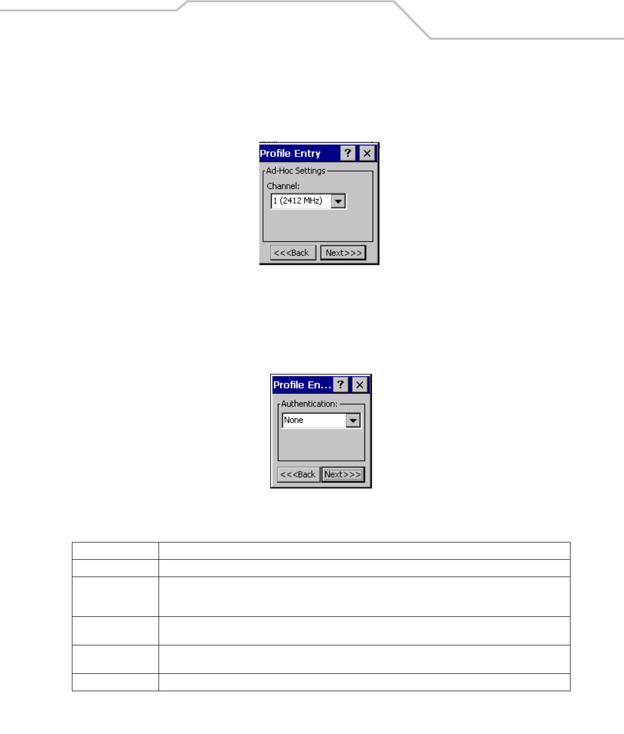 Tap Next. If Ad-Hoc mode was selected the Ad-Hoc dialog box displays. If Infrastructure mode was selected the Authentication dialog