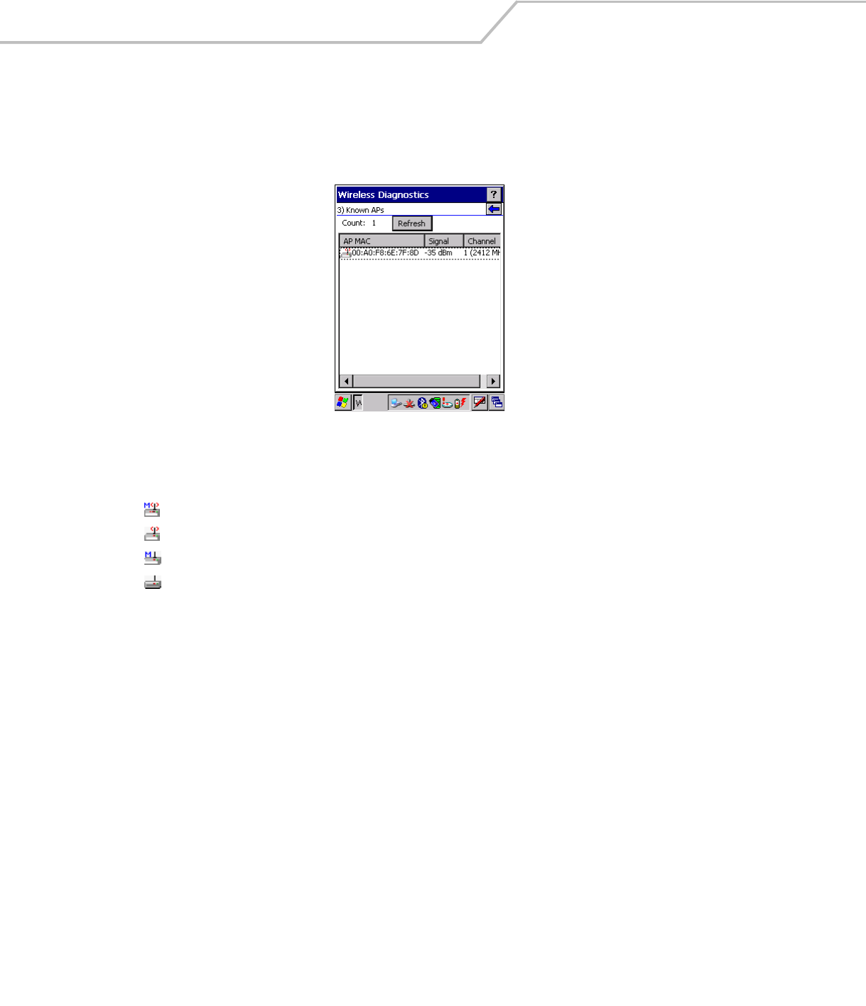 The Signal Strength icon in the task tray indicates the mobile computer’s wireless signal strength as follows: