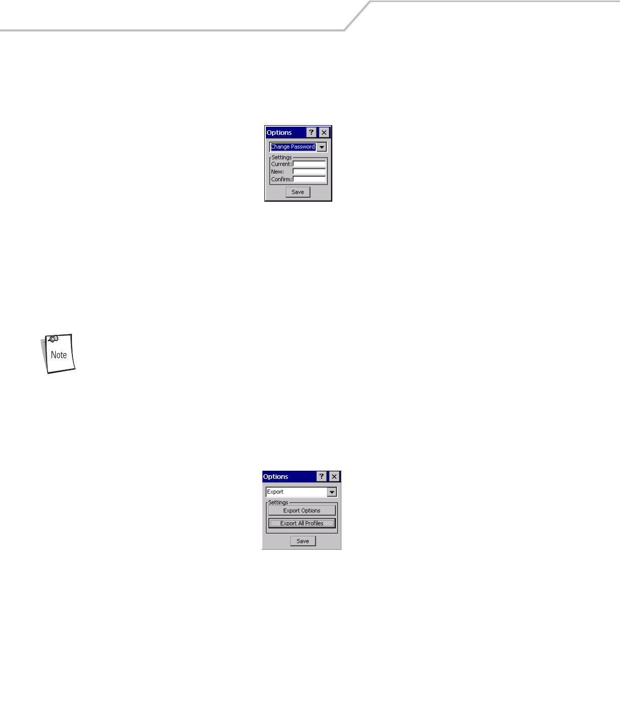 Use the Export dialog box to export all profiles to a registry file, and to export the options to a registry file. Each of these export