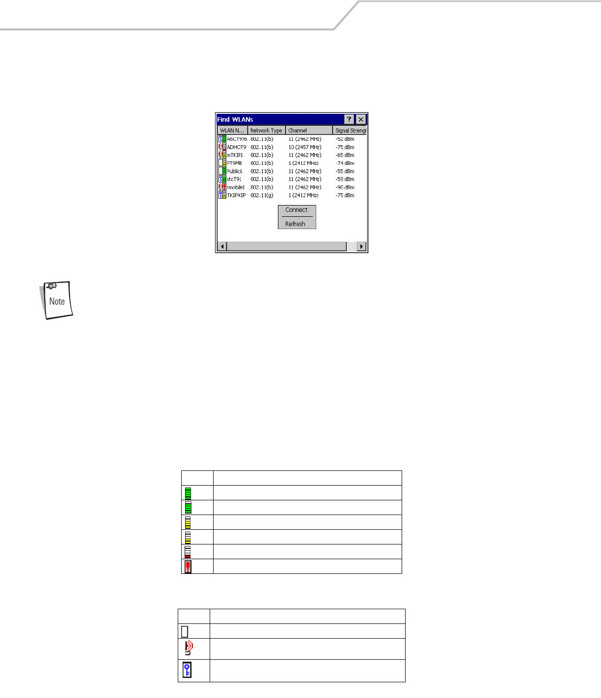 • WLAN Networks - Available wireless networks with an icon that indicates signal strength and encryption type. The signal