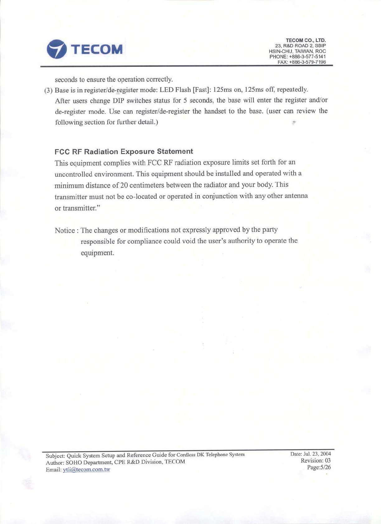 Subject: Quick System Setup and Reference Guide for Cordless DK Telephone System Date: Jul. 23, 2004