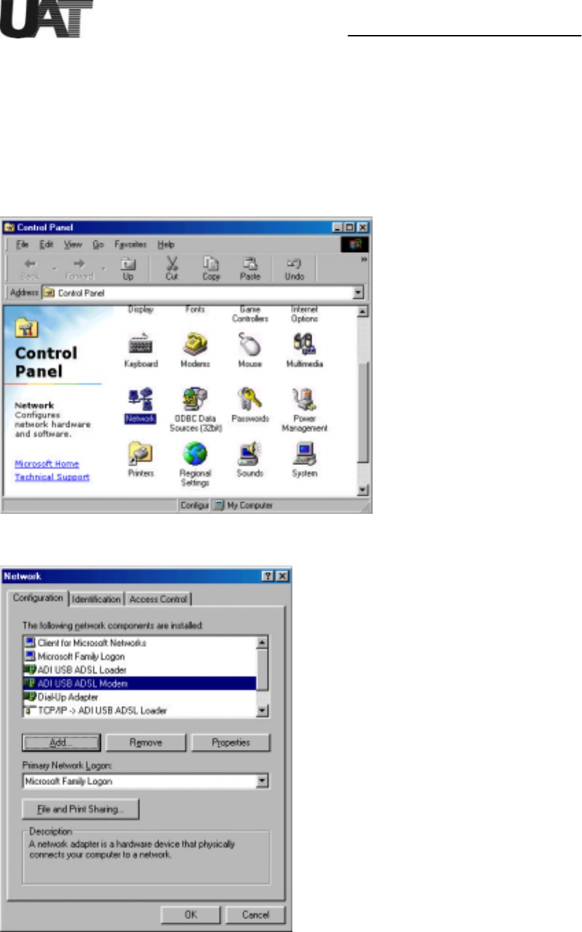 Open “Network Panel” from “Control Panel” folder. “ADI USB ADSL Modem” entry under the Adapter tab