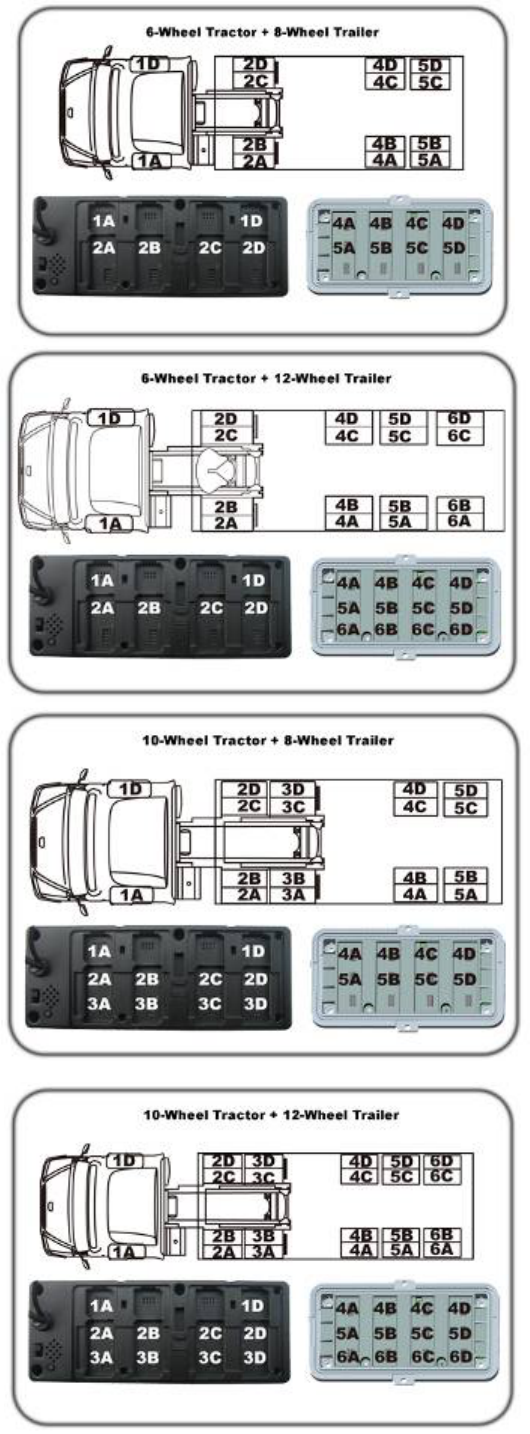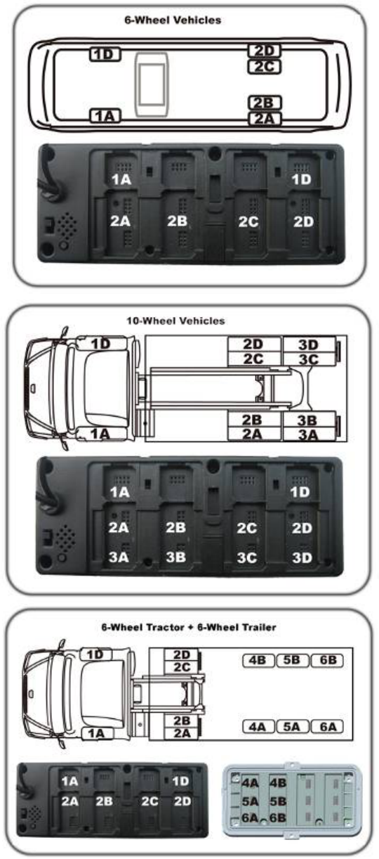 The following diagrams are the default relationship between ID module slots and tyre