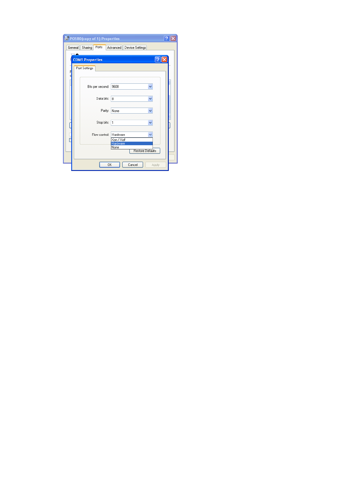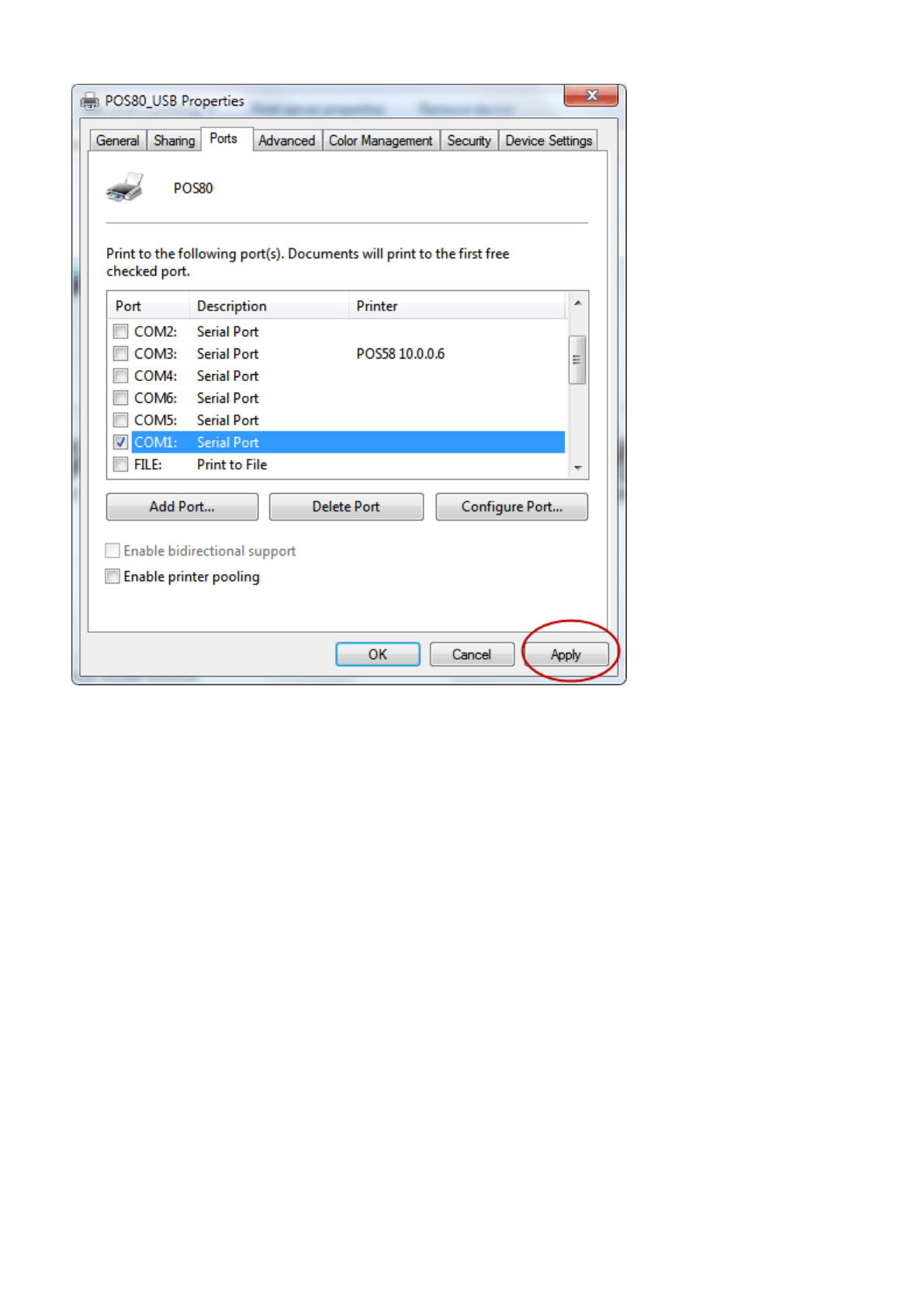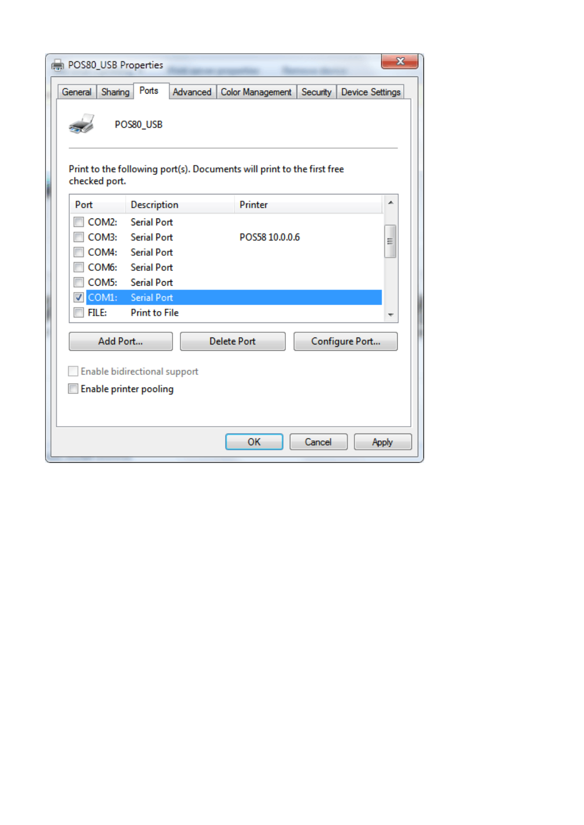 2. Select the list of ports "COM1" → "Configure Port", the printer factory