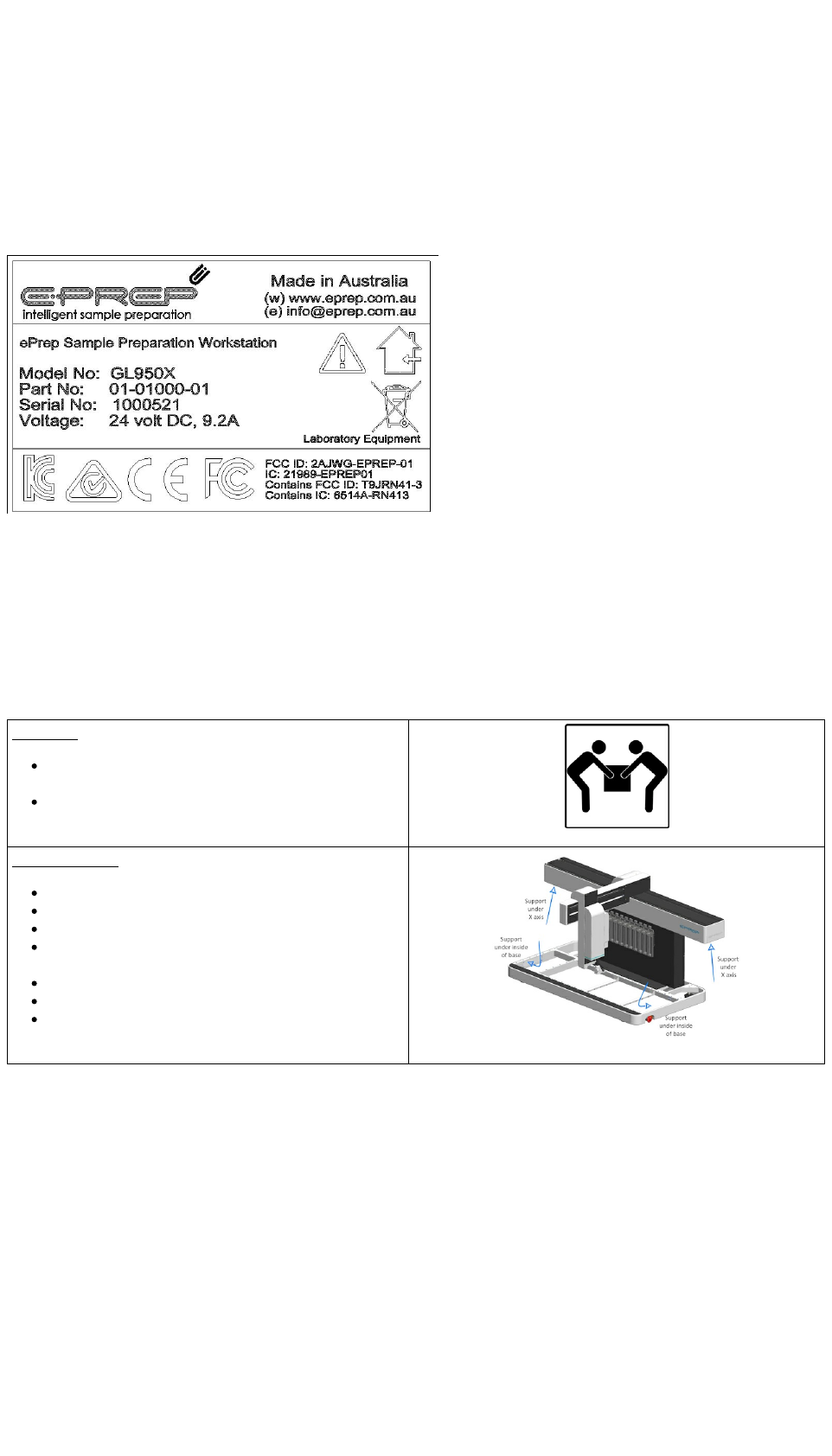 Boxed ePrep weight = 120kg and ePrep instrument =65kg. Precautions must be taken when lifting and